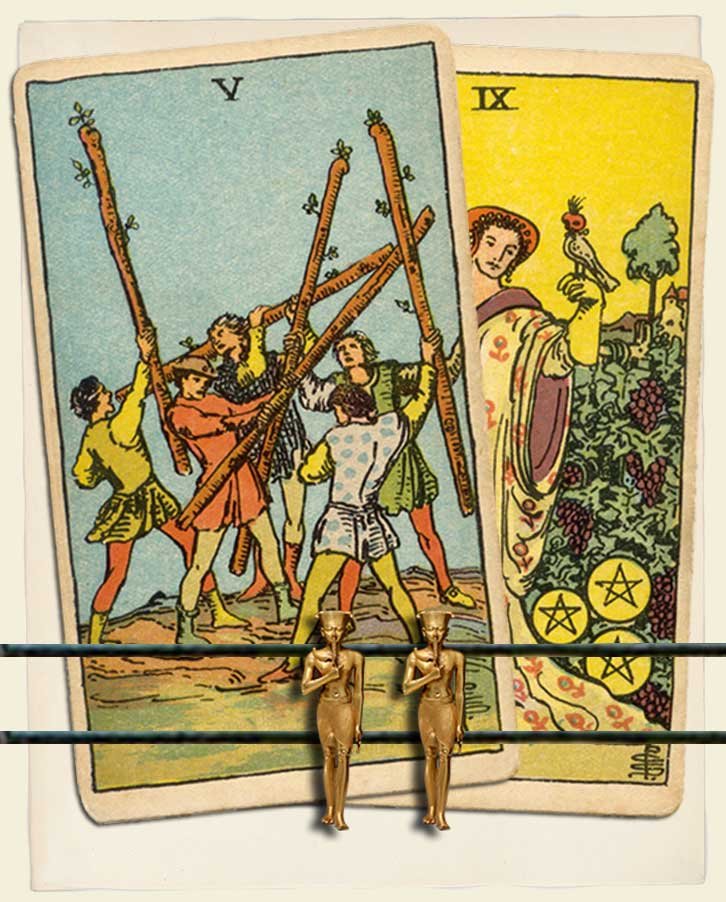 Hey, y’all! So today we’re talking about the Five of Wands and Nine of Pentacles combination in regards to love and relationships. This combo is considered an indifferent sign for love and relationships, but let’s break it down a bit more.