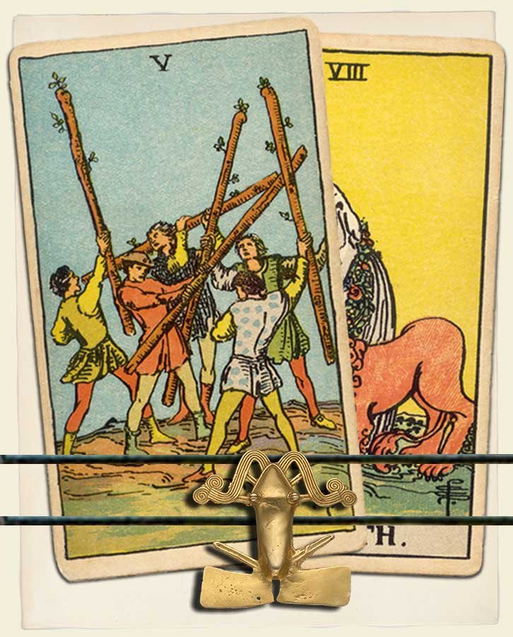 Five of wands and Strength combination gives you intuition about your distant and barely discernible future, which will arise from the combined effect of: (I) Competition (effect of Five of wands) and (II) Influence (effect of Strength). Those around you are racing down a track to nowhere. Observe the unhealthy elements of competitiveness in those around you, and you will learn how to use your own sense of ego in a positive way. All lessons from those around us can be used to our benefit if done with intention. Do not give in to the influence of others but rather read a chapter of their book and infuse the wisdom into your own.