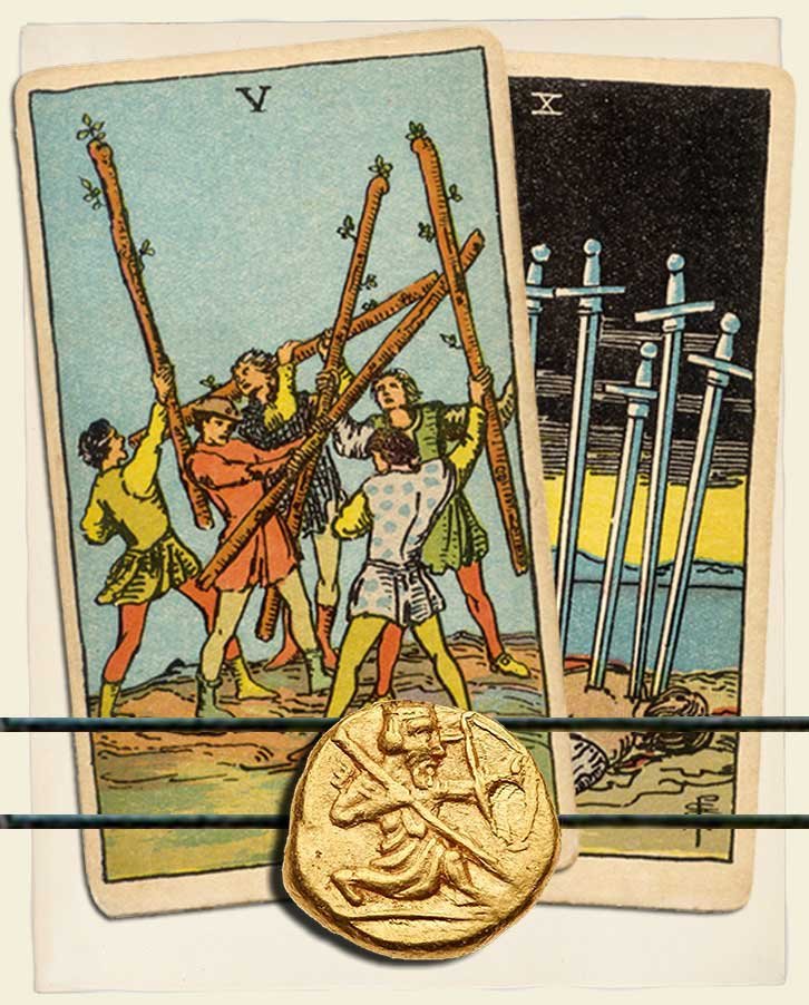 The Five of wands and Ten of swords combination in the tarot deck is not a good sign for love and relationships. This combination signifies that aggression and deep wounds are currently guiding your decisions. The advice from this pair is to close out this chapter of your life as it represents a painful ending caused by betrayal.