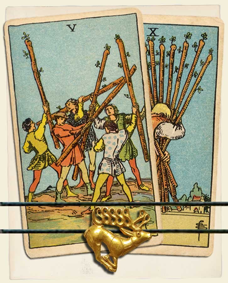 Well, darling, let me break it down for you. The Five of Wands and Ten of Wands combination is a lousy sign for love and relationships. It’s quite clear that this tarot reading suggests that you’re a hardworking individual who enjoys being the best in the room. Now, there’s nothing wrong with that per se, but beware of all the extra responsibilities you’re signing up for just to ensure your superiority.