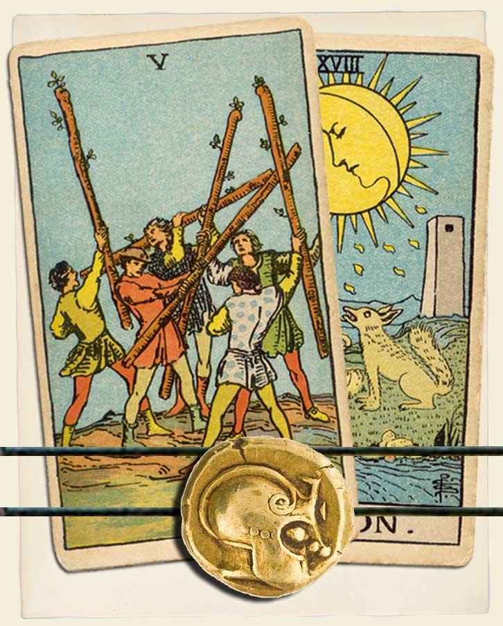 Five of wands and The Moon combination means that mystic tarot forces: 1) Aggression and 2) Intuition govern your life decisions today. There is a time for peace, and a time for war: this one, is probably the latter. You will be challenged, and the moment will come when you’ll feel the “beast” waking up inside yourself. Your boundaries will be tested, and you will do well to protect them. Take action, but move in tune with your subconscious: not all actions need to be evident, sometimes undermining your enemies’ forces may help you win without getting your hands dirty.