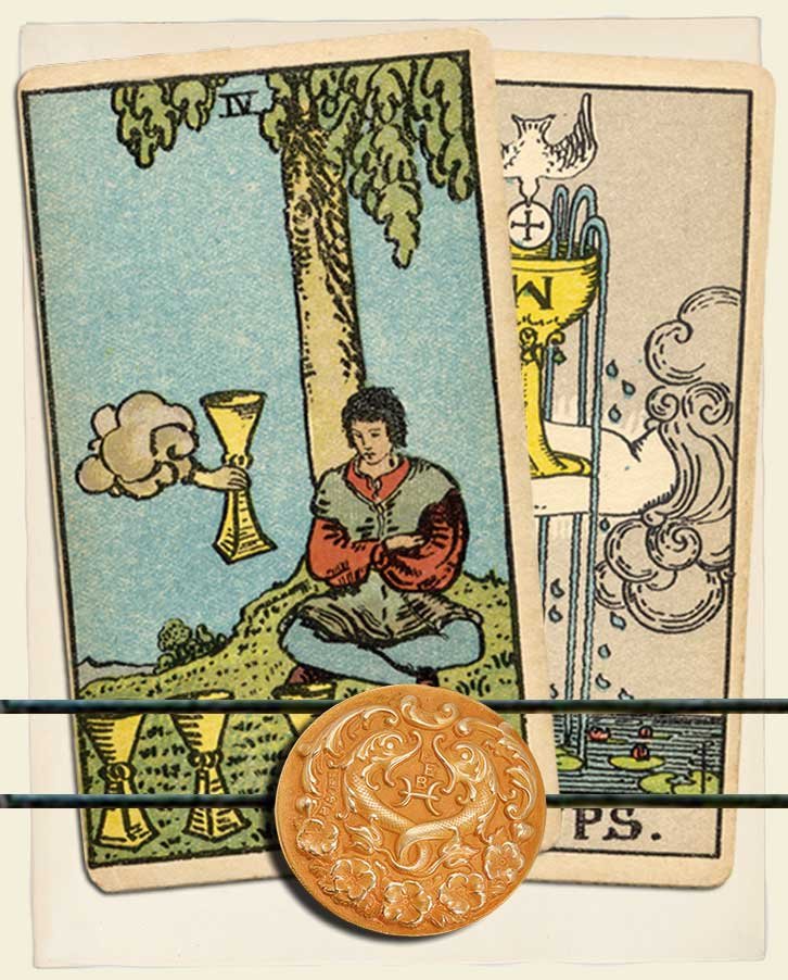 Four of cups and Ace of cups combination is a sign that two tarot influences: A) APATHY (Four of cups) and B) INTUITION (Ace of cups) are exerting their influence on your life’s choices. In other words, it means that you have to “let it go”, like a famous princess once sang. That’s right: the apple is going to fall right on your lap while you take your beauty sleep. The Tarot cards want to spoil you today: and so does someone here on earth… Don’t let this chance go to waste!