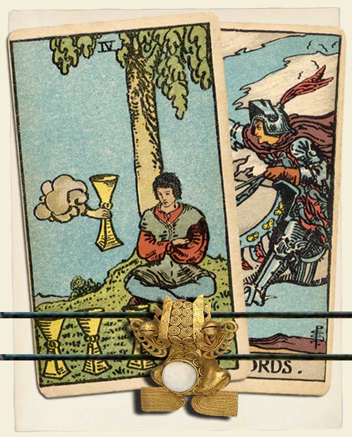 Four of cups and Knight of swords mean that two tarot influences: 1) Contemplation (Four of Cups) and 2) Ambitious (Knight of Swords) are affecting your life path at this reading. Most tarot readers would consider this permission to end your contemplation and apply for that management job. But, with the arcane aspect of the Four of Cups, you should take this as a caution. Although the contemplation you’ve been doing may seem tedious don’t let it allow you to make too hasty a decision. Keep your options open for a while longer.
