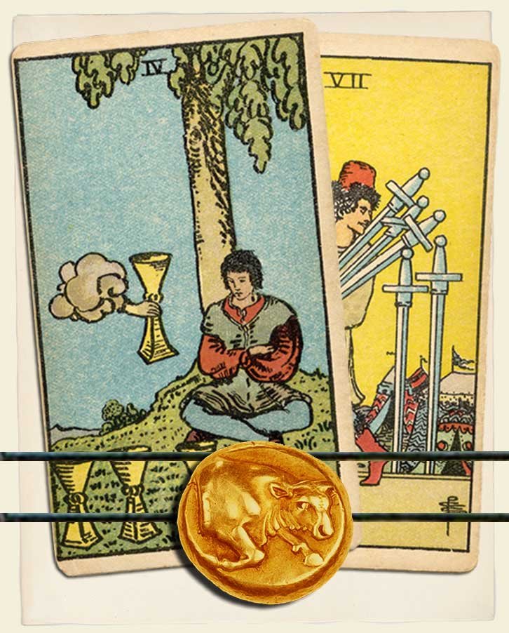 Four of cups and Seven of swords tarot combination gives a glimpse into an outcome in your future, which is influenced by the tarot forces of (I) FEELING DISCONNECTED (from Four of cups) and (II) GETTING AWAY WITH SOMETHING. To put it differently, it means you are unhappy with life and/or your relationship. So you are going out and cheating on your relationship, or wanting to go out and cheat. You feel so disconnected from the life you have in front of you that you are dreaming of a new life: a different one in which you are happy with your partner. This disconnect and unhappiness is leading into a questionable choice, one that can take everything from you.
