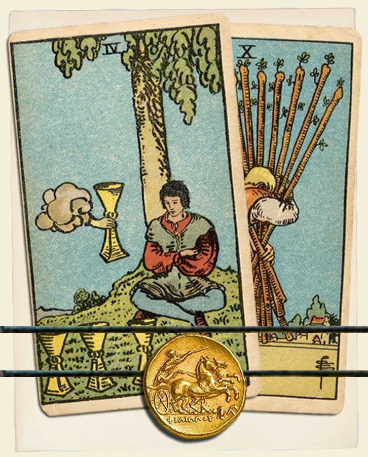 Four of cups and Ten of wands tarot combination means that two mystic forces: (1) Indifference (Four of cups) and (2) Stress (influence of Ten of wands) – are at play. How to interpret this tarot combination in practice? This pairing indicates stressful situations arising in your life as a direct relation to your dissatisfaction in your daily life. In other words you’re bored!! The 4 of Cups asks you to try something new and push yourself outside of your comfort zone, or incorporate a new daily routine to help break yourself out of this stagnant energy.
