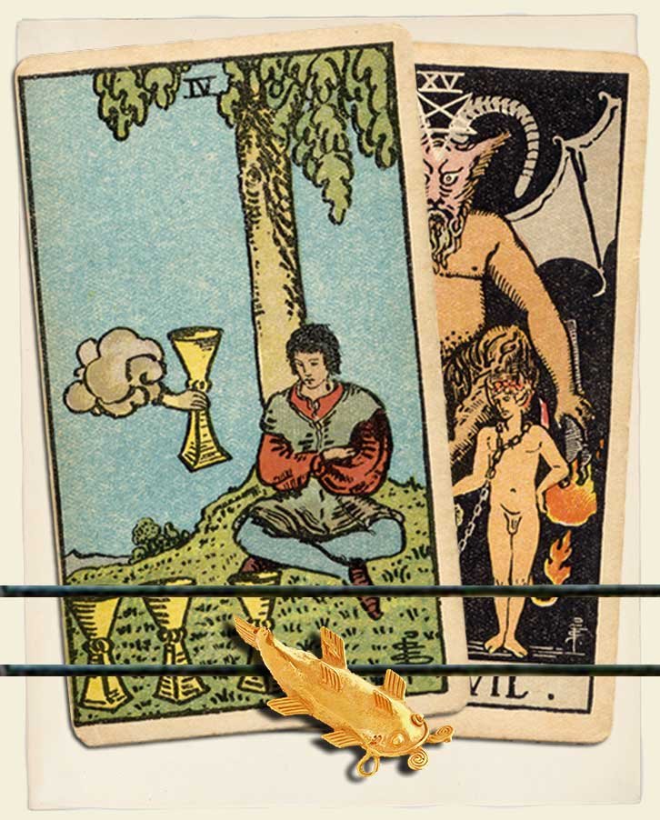 Four of cups and The Devil combination indicates that two mystic forces: 1) Reevaluation and 2) Shadow Self govern your life decisions today. You may have been avoiding the truth about yourself for a while now, but it is time to face the music. It is time to reevaluate who you are and what you want from life, because if there is one thing The Devil knows, it is how to get what he wants. This could be painful or even humiliating at times, but in the end it will lead to growth—growth that will benefit you for years to come.