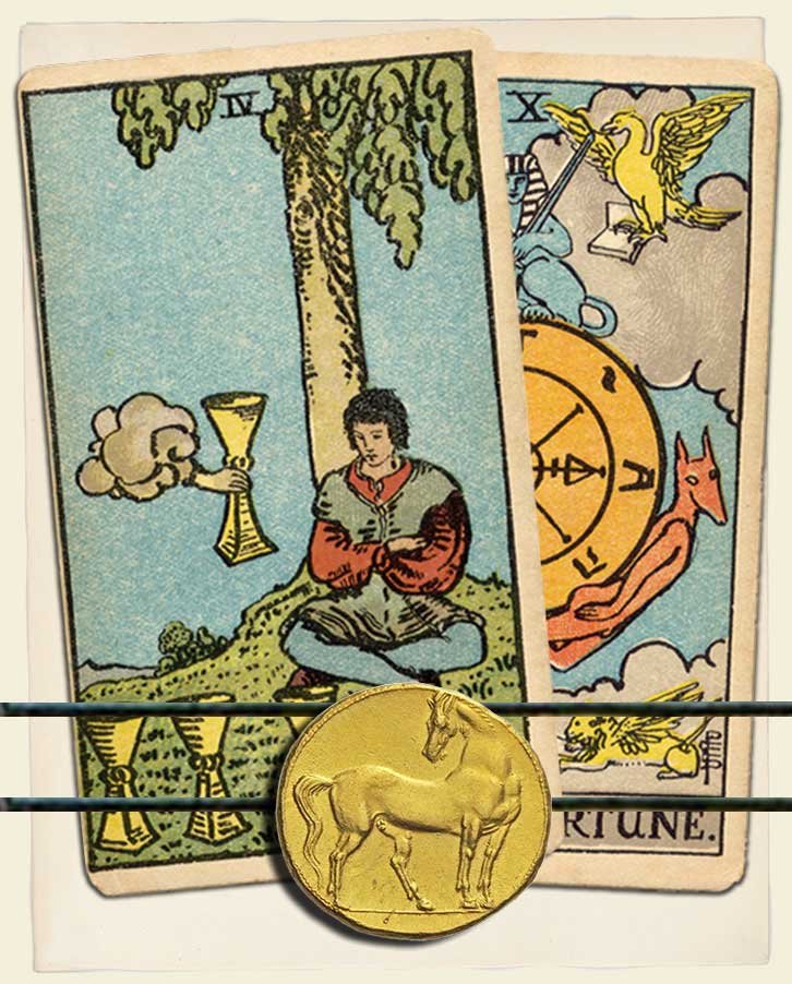 The Four of Cups and Wheel of Fortune combination is a complex one, with two mystic forces influencing your love life. While contemplation can be a positive trait, too much of it can prevent you from accepting positive change in your relationships. The world is constantly evolving, and if you want to be happy in love, you need to accept the changes that come your way.