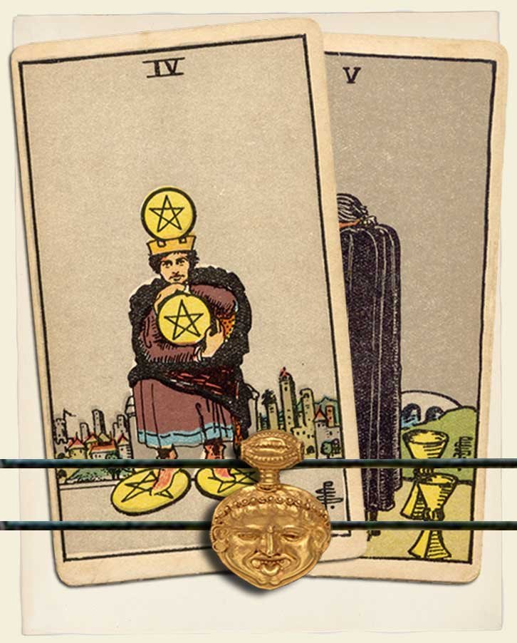 Four of pentacles and Five of cups tarot combination means that two tarot influences: 1) Scarcity (from the side of Four of pentacles) and 2) Pessimism (from the side of Five of cups) have influence on you at this moment. To put it differently, it indicates you have very little in reserve for you. It’s as if you are giving away all your energy to other people, and whilst they might be grateful of it, you aren’t getting it back. This leads to a negative frame of mind that you can’t shake. But you can. You can do anything.