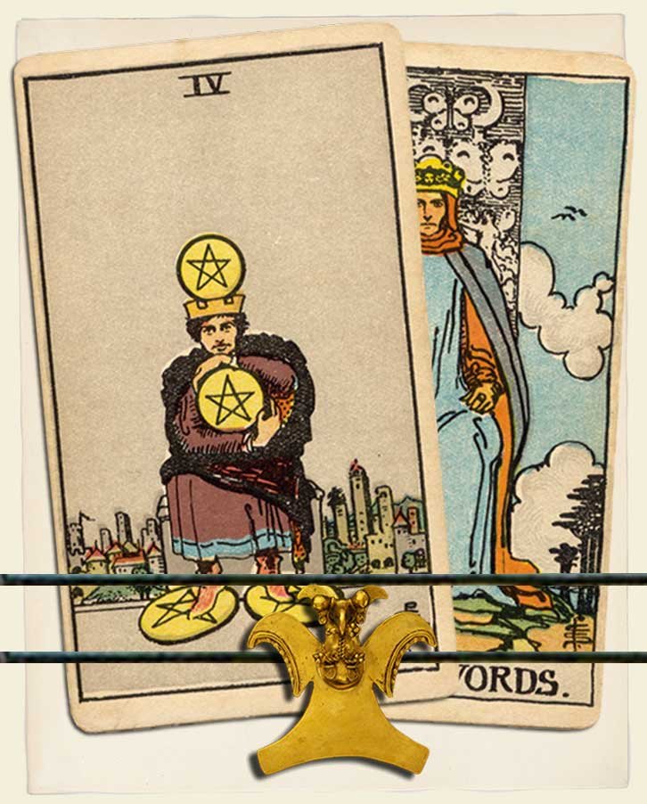 Four of pentacles and King of swords tarot combination means that arcane tarot forces: A) Scarcity (Four of pentacles) and B) Truth (King of swords) are affecting you in this card reading. Do you think someone is undermining you? People are always jealous of people at the top, but you don’t have to be afraid of that. You are safe and you are not losing anything. Don’t worry about what is not yours. Let go of your unwarranted fear and come out of your shell. You know you are capable of anything. Come on, have some courage, you know what you want, go and get it in one fell swoop. Connect with those around you today. Say, “I love you”, “I’m sorry”, “I appreciate you”, “I’m proud of you”… whatever you’re feeling. Send random texts, write a cute note, embrace your truth and share it. The people around you care about you and they will help you to see and accept your own truth.