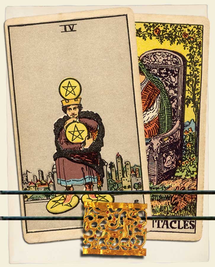 Four of Pentacles and Queen of Pentacles combo interpretation