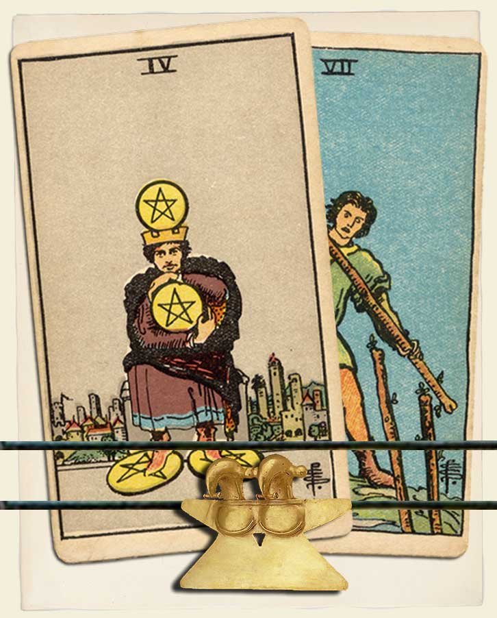Well, I’ll tell you what, folks. When it comes to love and relationships, the Four of pentacles and Seven of wands combination is not exactly a good sign. These tarot cards are telling us that we’re being influenced by hoarding and protecting territory – we’re holding on tight to what we have because we don’t want to lose it. But sometimes, if you hold too tightly, you end up losing everything anyway.