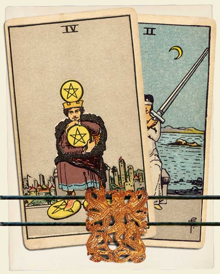 Four of pentacles and Two of swords combination means that arcane tarot forces: 1) Possessiveness and 2) Weighing Up Options are exerting their influence on your life’s choices. It is hard to walk away from situations where you feel as if someone has taken advantage of you, but it is even harder when the Four of Pentacles meets the Two of Swords. You may be afraid that walking away will cause more problems than leaving would solve. If so, consider talking with a friend or family member about what needs to be done next in this situation. The two can’t exist in isolation forever, and they need each other right now because they are both under stress.