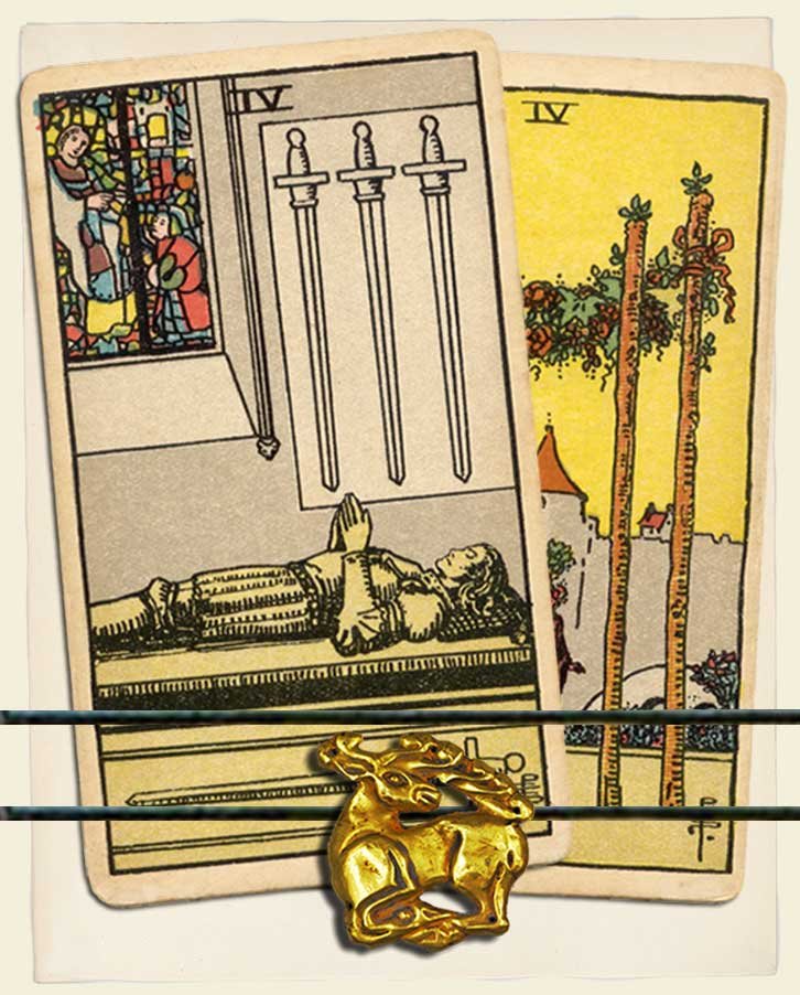 Four of swords and Four of wands tarot combination gives you a better insight into a situation in your future. It will come to pass from the combined effect of (1) RELAXATION (effect of Four of swords) and (2) HOMECOMING (effect of Four of wands). In other words, it means that your search will soon come to an end. God knows, you’ve searched high and low. The trouble is, you’ve been searching so long you’ve forgotten what you are looking for. Still, don’t fret, these cards say: soon, you’ll be like the woman who, having looked everywhere for her glasses, finally stops –only to find them hung around her neck.
