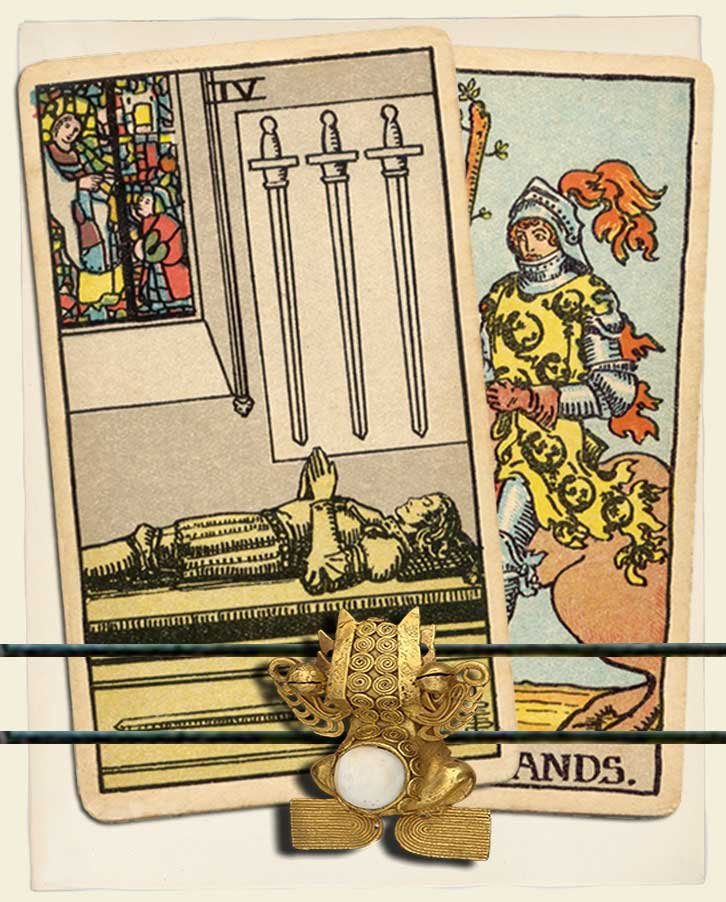 Four of swords and Knight of wands combination signals that two tarot influences: A) Rest (Four of swords) and B) Inspired Action (Knight of wands) guide your life decisions today. How to interpret this in practice? In essence, your next move will be best informed by an intentional pause to self-reflect. Despite the urge to propel yourself into action, you are being asked to find internal stability first. You may have felt troubled lately or simply have had a lot on your plate. No matter your circumstances, it’s good to pause and take a breath every once in a while. Finding a balance between reserve and spontaneity could be beneficial as well.