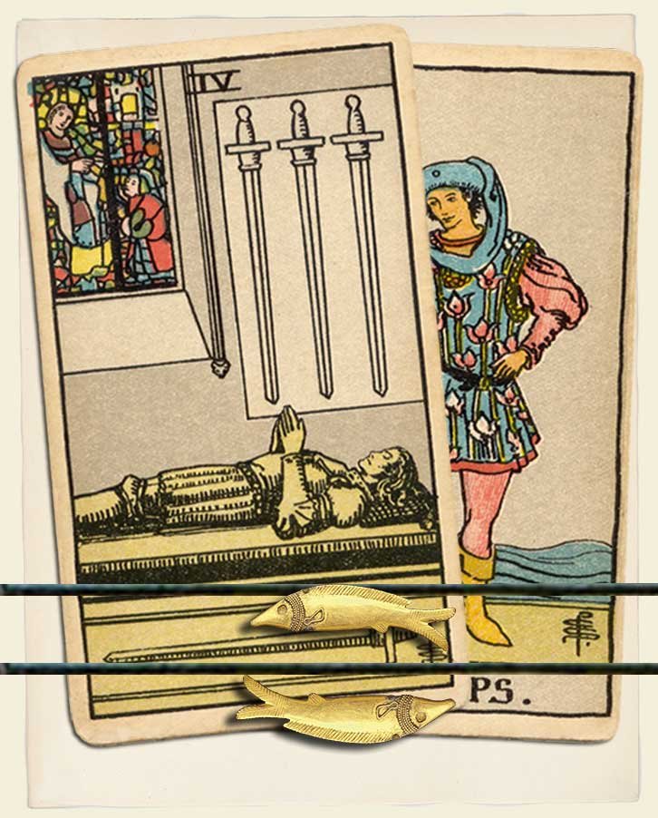 Four of swords and Page of cups combination provides an insight into an important development in your future. It will take place as a result of (1) Relaxation (effect of Four of swords) and (2) Dreamer (effect of Page of cups). What’s the advice of this pair? The Four of Swords represents rest and rejuvenation after intense mental activity. This is a card that indicates you need to take some time off from work on something you may have been overworking on, so to speak. The Page of cups indicates that there is someone at hand who cares deeply about you, but it also points to daydreaming tendencies. In other words, someone with whom you can share your thoughts without much practical application occurring. Take advantage