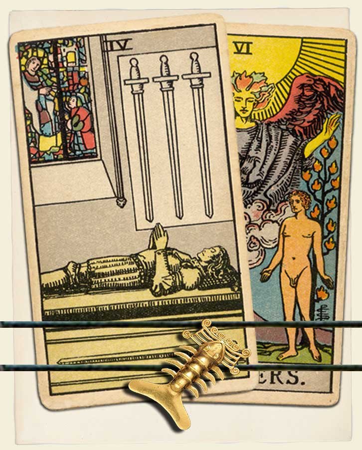 Four of swords and The Lovers tarot combination means that two forces: 1) MEDITATION and 2) RELATIONSHIPS are steering you into another direction today. To put it differently, it gives you a sign that you will need to retreat within. Think of it this way: you can’t hope to develop strong bonds with others if you don’t have one with yourself. True, it’s a cliché—but some clichés are clichés for a reason. In other words: if you want to find love in the outer world, dive within.