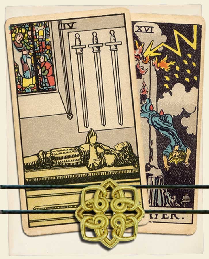Four of swords and The Tower combination indicates that two forces: 1) Peace (Four of swords) and 2) Destruction (The Tower) are influencing you at the moment. How does this card combination affect you in practice? The unforeseen changes that have entered your life are knocking you down to your hands and knees and you may be feeling lost with how to proceed. This is a great opportunity to overcome this change by gathering new strength to face the challenge. Like a car, you must refill the oil in the tank. Take this time to re-charge with quiet people and environments. Essential oils and candles may prove calming.
