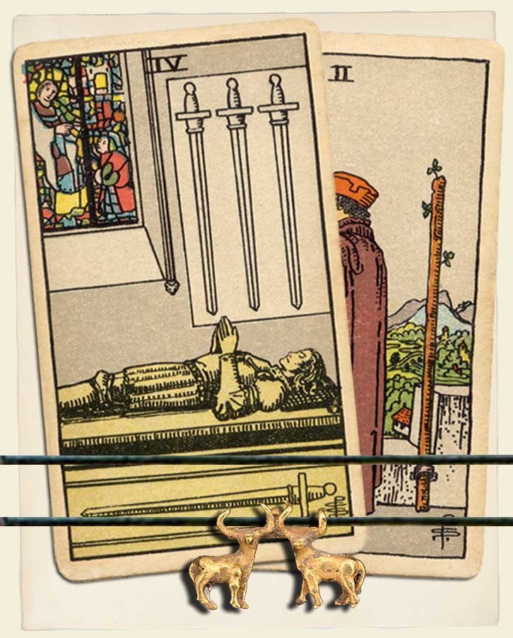 Four of swords and Two of wands tarot combination means that arcane tarot forces: (1) Relaxation and (2) Planning (influence of Two of wands) are affecting you in this card reading. To put it differently, it gives you a sign that you need to slow down, take a much-needed breath. Clearly think about your plans without the influents of anger and emotions. Clarity only comes when you relax the mind and really think though everything. That is when a clear path will be shown.