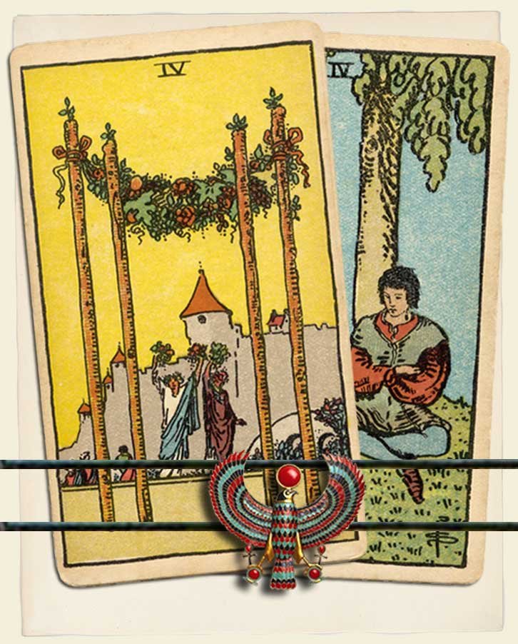 Four of wands and Four of cups combination indicates that two arcane effects: 1) Reunions (Four of wands) and 2) Meditation (Four of cups) are affecting you in this card reading. In other words, you will soon rediscover an old friend. Still, it probably won’t be who you think. For so long now you’ve been atop your misty mountain in search of wisdom. Still, it’s pretty lonely up there, right? Well, hold on, these cards suggest. Soon enough, you will reach your goal— then you will be reunited with the greatest ally you could hope for: your true self.