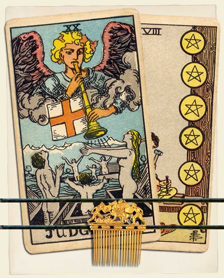 Judgement and Eight of pentacles combination mean that two tarot influences: 1) Inner Calling and 2) High Standards are jointly affecting you today. In other words, it means today is your wake-up call. You are now falling into your purpose. When these two cards show up in a reading, it is good. You’re busy mastering your craft, elevating your skills to a higher standard. This will soon lead to your true calling and you must be ready to embrace it.