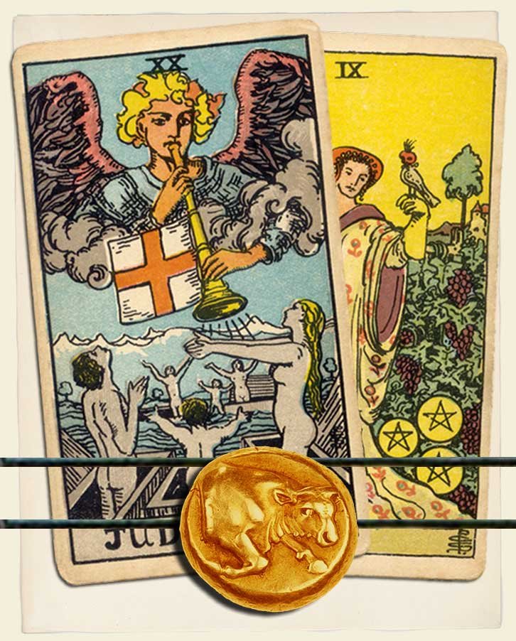 Judgement and Nine of pentacles combination gives a glimpse into a major event in your future, which is influenced by the arcane tarot forces of (A) rebirth and (B) achievement. If this pair appears you can expect to see a reflection of the fruit of your labor soon. Recommended rewards will be of significance during the time as well if this pair appears in your reading. This combination indicates that an awakening will be occurring and it will lead to a life of luxury.