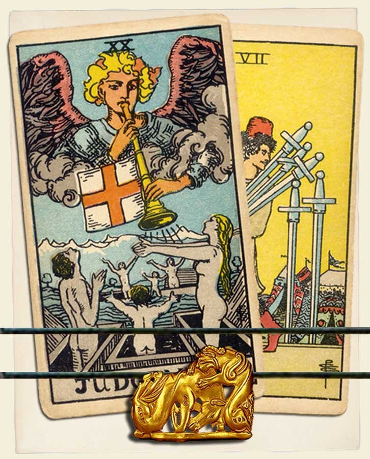 Judgement and Seven of swords combination gives you a hint about a major event in your future, which is directed by the guiding influences of (A) Renewal and (B) Lies (as clarified by Seven of swords). You may be facing a difficult situation, something that you might’ve been struggling with for some time. Judgment tells you it’s time to make that decision, while the Seven of swords suggests that some trifling tramp may try to betray or deceive you. Listen to your inner voice and try to get to the bottom of things before they can fool you. Once you have all the receipts, you can make an informed decision about what to do next.