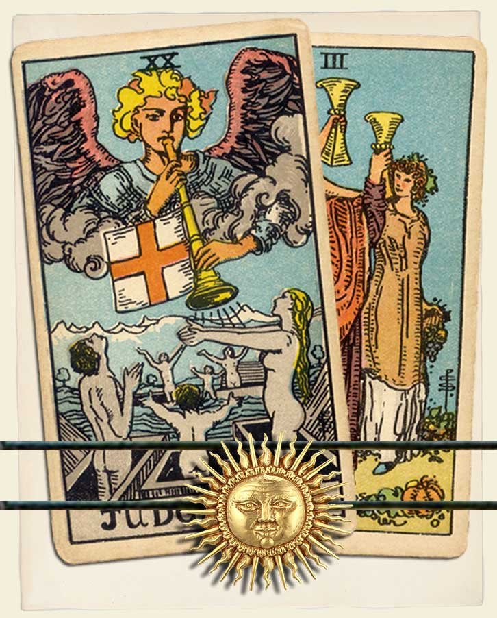 Judgement and Three of cups combination gives a clearer perception about a major event in your future, which is influenced by the tarot forces of (I) SELF-EVALUATION (from Judgement) and (II) CELEBRATION. What’s the advice of this pair? Judgement represents deep self-reflection that allows your true self to emerge. This card indicates that you need to perform this self-evaluation in order to take an important next step. The Three of cups is a card of friendship, coming together and celebration. It can also represent distractions, though. The self-evaluation Judgement requires is very personal. Be careful who you invite into it, and consider doing it in solitude. When you emerge a better version of yourself, then call your friends to celebrate.