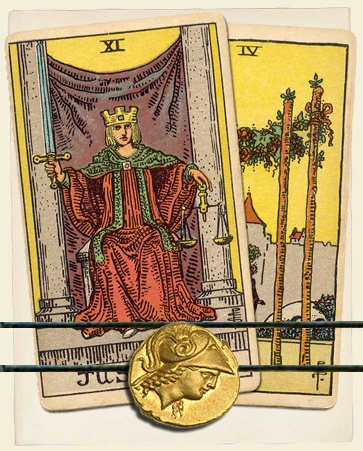 Justice and Four of wands combination gives an insight into your immediate future. It is directed by the guiding influences of (A) Karma and (B) Celebration. To put it differently, it indicates that a wrong will be righted in your life. What’s the advice of this pair? Justice indicates that something unfair will be brought into balance. This is a powerfully karmic energy under which secrets are often brought to the surface to be judged. This will create a difficult and perhaps even painful time, as people reap what they sow. The Four of wands is a card of safety and celebration that indicates that you will end up on the right side of this situation, so don’t worry when the judge is banging the gavel.