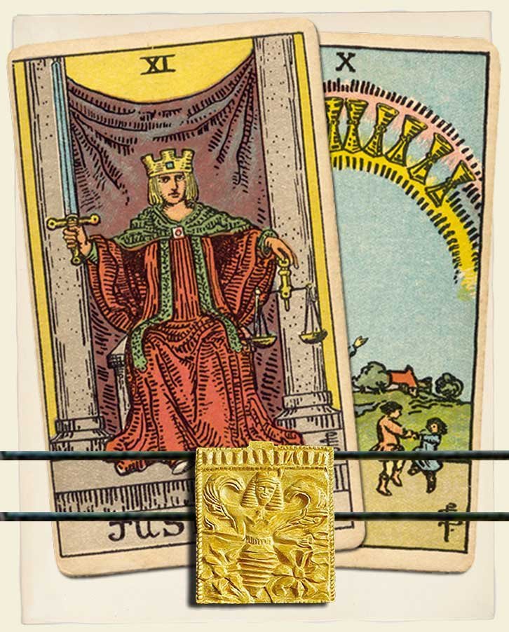 When it comes to love and relationships, the combination of Justice and Ten of cups is a positive sign. The mystic tarot forces of justice and happiness are affecting your life path at this reading, meaning that once you take accountability for your actions, true joy will follow.