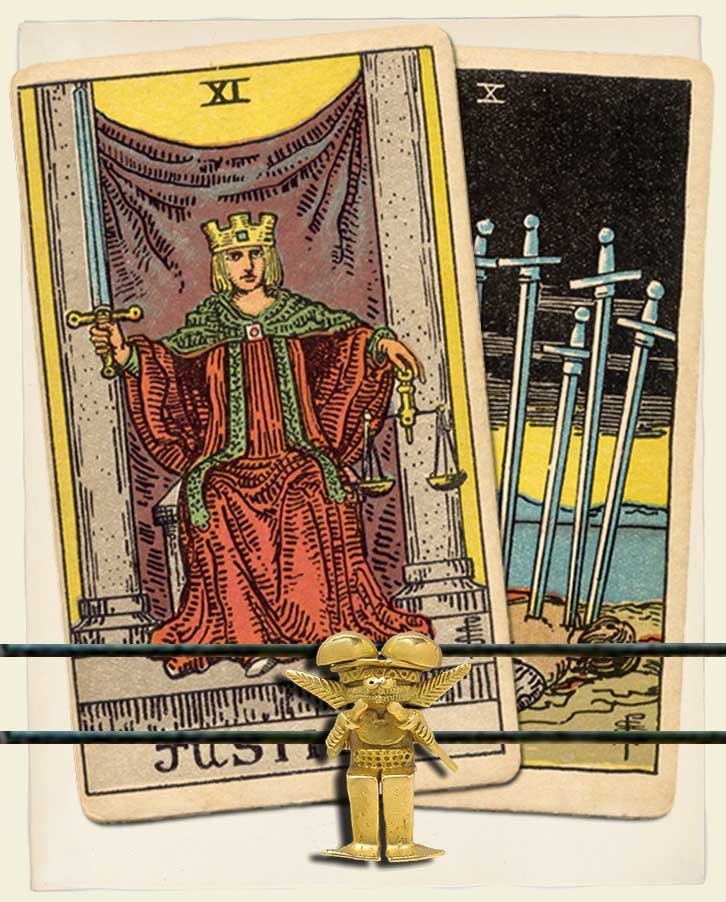 My dear child, the combination of Justice and Ten of Swords in matters of love and relationships is a sign from the universe that you will soon have to face a difficult situation with your partner. The forces of accountability and ruin are at play here – it means that something has been going on behind your back for quite some time now, and you’ll finally become aware of it.