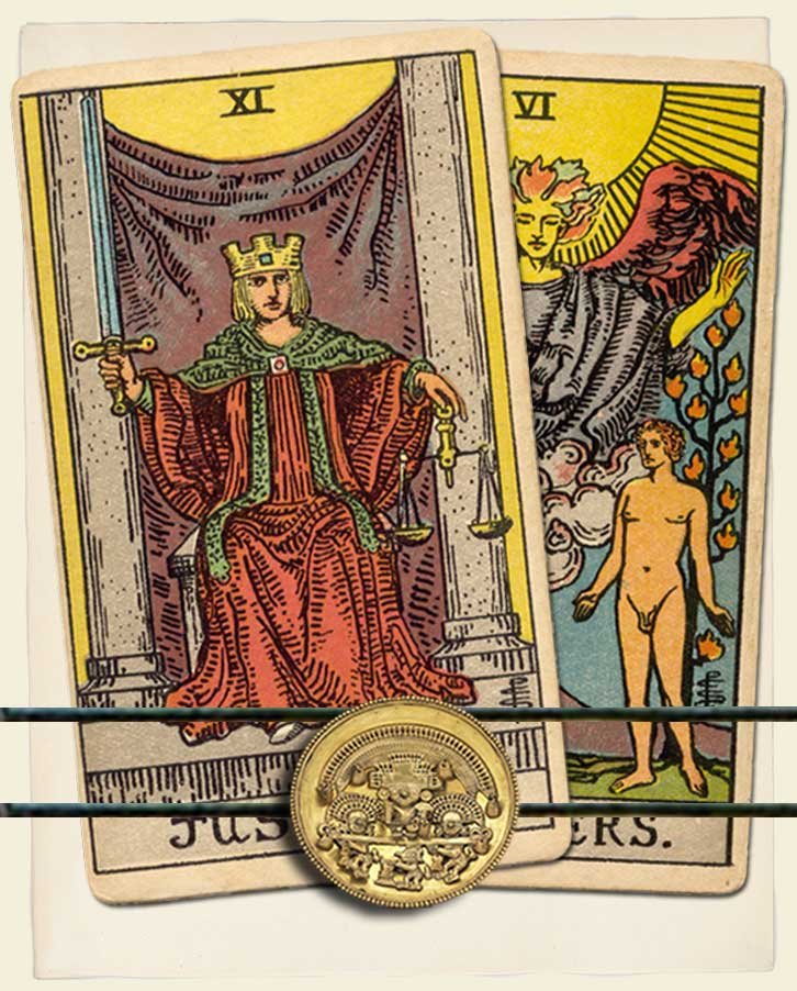 Justice and The Lovers tarot combination gives an insight into your medium-term future, which is directed by the guiding influences of (A) ACCOUNTABILITY and (B) LOVE (as clarified by The Lovers). What’s the advice of this pair? You are being called to look at the skeletons in your closet. The presence of Judgement calls for intense and truthful self-reflection. Much of what you’ve suppressed needs to be brought to the surface, so you can complete an important cycle in your life. Judgement can be a harsh energy. Here, it is tempered by the presence of The Lovers card, which represents a strong, loving bond that forms the foundation of a healthy relationship. The Lovers are naked to each other and see each other clearly. Judgement is a reminder to have that same clarity with yourself. Your ability to be truthful with yourself affects your ability to be truthful with others.