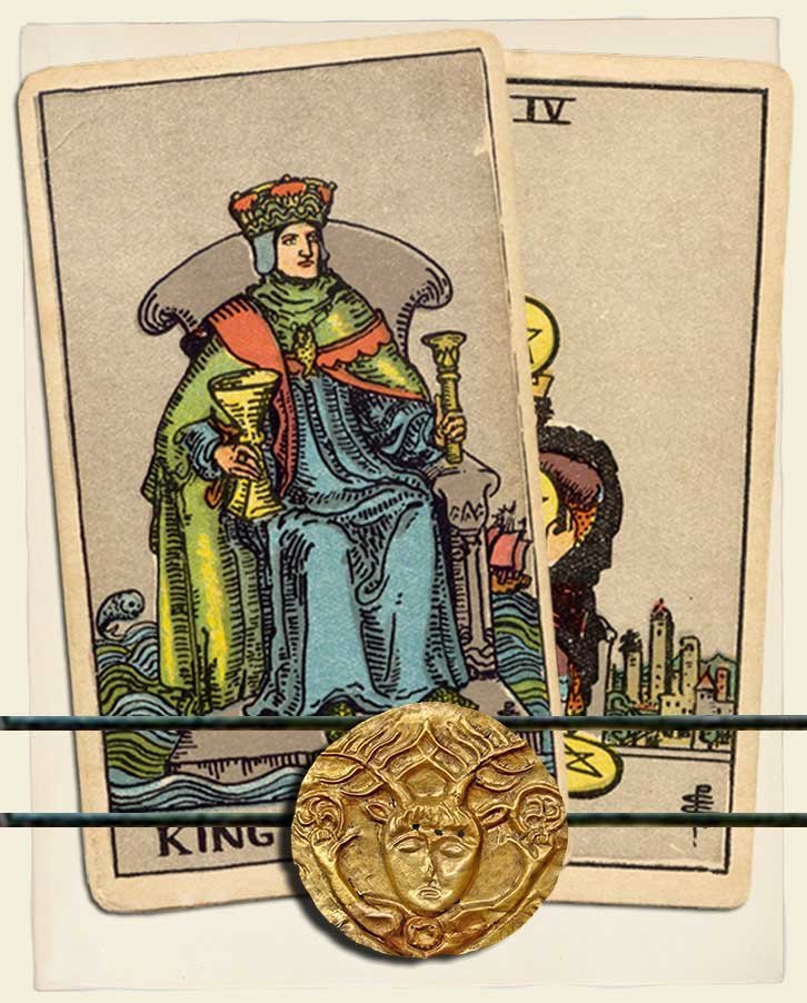 Yo, so if you pull the King of cups and Four of pentacles in a love reading, it ain’t lookin’ too clear. Basically, these cards are sayin’ that you like to be in control but soon there might be someone above you makin’ decisions based on your ideas. But y’all gonna disagree on somethin’ important. So don’t be afraid to switch it up and come at things from a new angle.