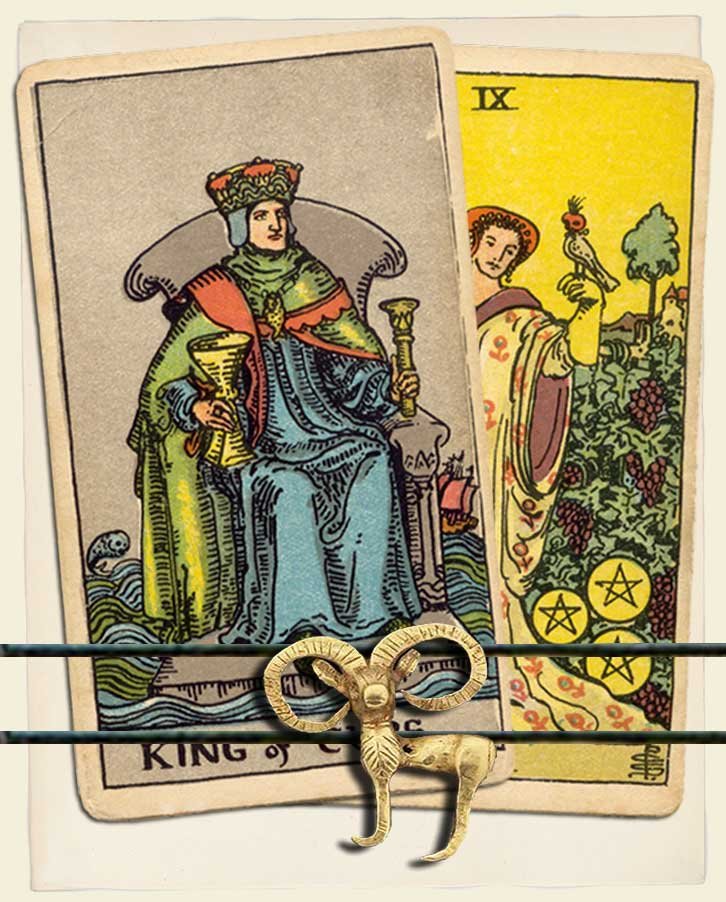 Hey y’all! So, the King of cups and Nine of pentacles combination is a really good sign for love and relationships. Basically, this means that you’re balancing your head and heart while being rewarded for your efforts in life. It’s all about emotional maturity and success.