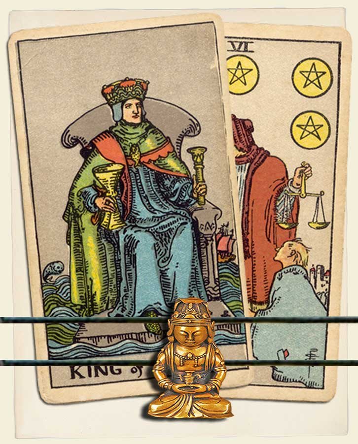 Well, now, what we have here is an interesting combination of the King of cups and Six of pentacles for love and relationships. And let me tell you folks, this combo is considered a fine sign for those looking to improve their romantic situation.