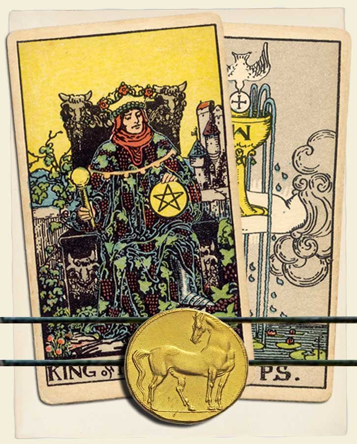 King of pentacles and Ace of cups combination indicates that arcane tarot forces: 1) Prosperity and 2) Compassion currently guide your decisions. What’s the advice of this pair? The King of pentacles is a wise, stable energy that brings abundance into our lives. This card often represents an older male who has seen life from many different perspectives. It can be difficult to know how to act in such a manner, though. The Ace of cups represents emotions flowing freely and compassionately. There may be situations or people in your life where you feel they deserve another chance because they are suffering needlessly. Be careful about taking on too much responsibility for someone else’s happiness.