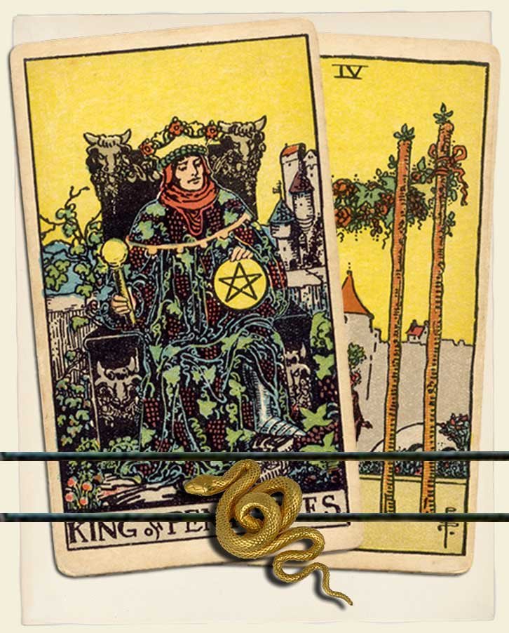 King of pentacles and Four of wands combination indicates that mystic tarot forces: 1) Wealth (influence of King of pentacles) and 2) Home (influence of Four of wands) are altering your life path today. In other words, it means that there is some sort of fight or competition over money or material things. There may be some sort of conflict with security or stability going on as well if this pair appears. You can expect some sort of rivalry whenever this combination pops up. Prosperity will be if significance.