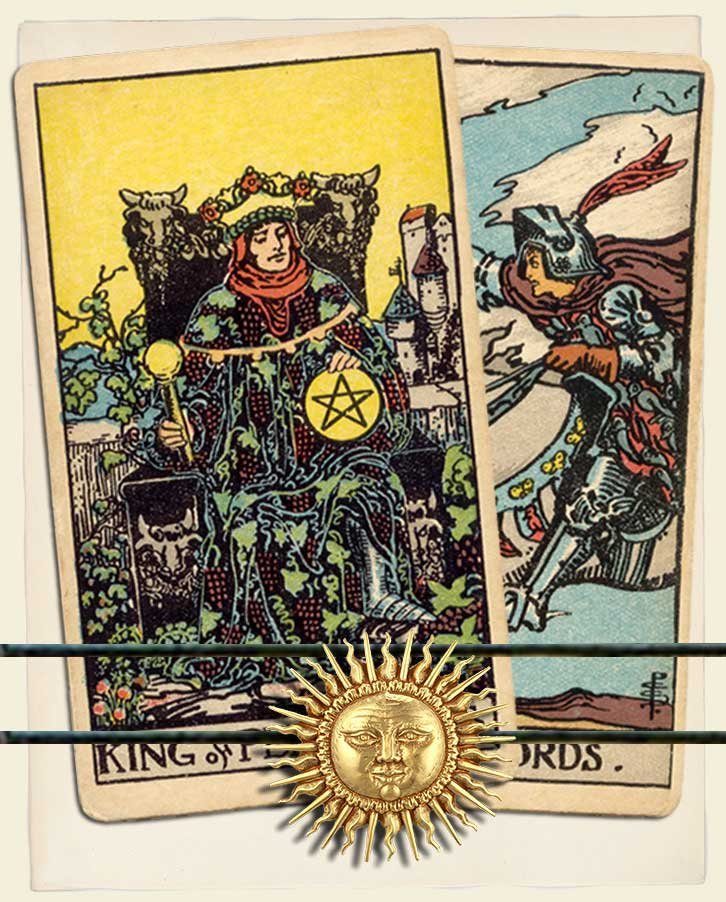 King of pentacles and Knight of swords tarot combination gives you intuition about your medium-term future, which is influenced by the tarot forces of (I) ABUNDANCE (from King of pentacles) and (II) DARING. To put it differently, it indicates that it’s time to take the reins and create your own luck. You have the will and skillset necessary to achieve your goals. You are being called to take decisive action to build the life and resources for yourself that you dream of. Even if as little as finally starting that small business on the side of your career, this tarot combination encourages you to charge ahead. No matter the goal, trust your capabilities to carry you along your journey.
