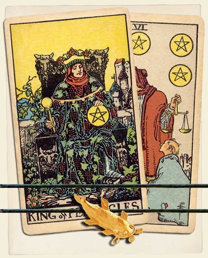 Ah, the King of pentacles and Six of pentacles combination for love and relationships. It is a good sign indeed. These arcane tarot forces bring forth two key themes: leadership and community.