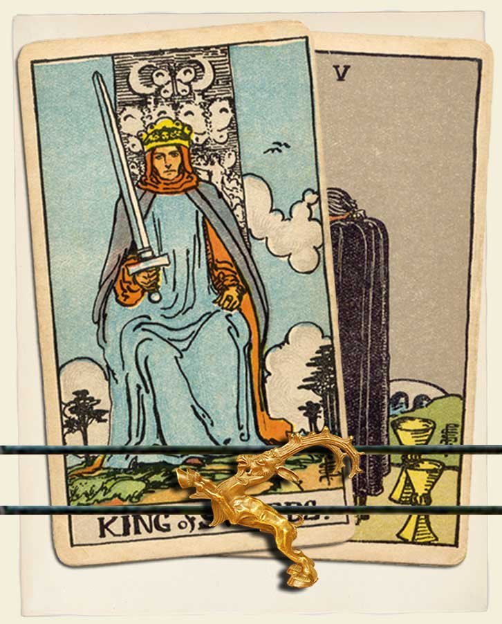 The King of Swords represents a focused energy that does not tolerate nonsense. It can be intimidating but has the power to cut through any obstacles on your journey. On the other hand, the Five of Cups indicates that something from your past will impact how you feel about yourself for some time to come.