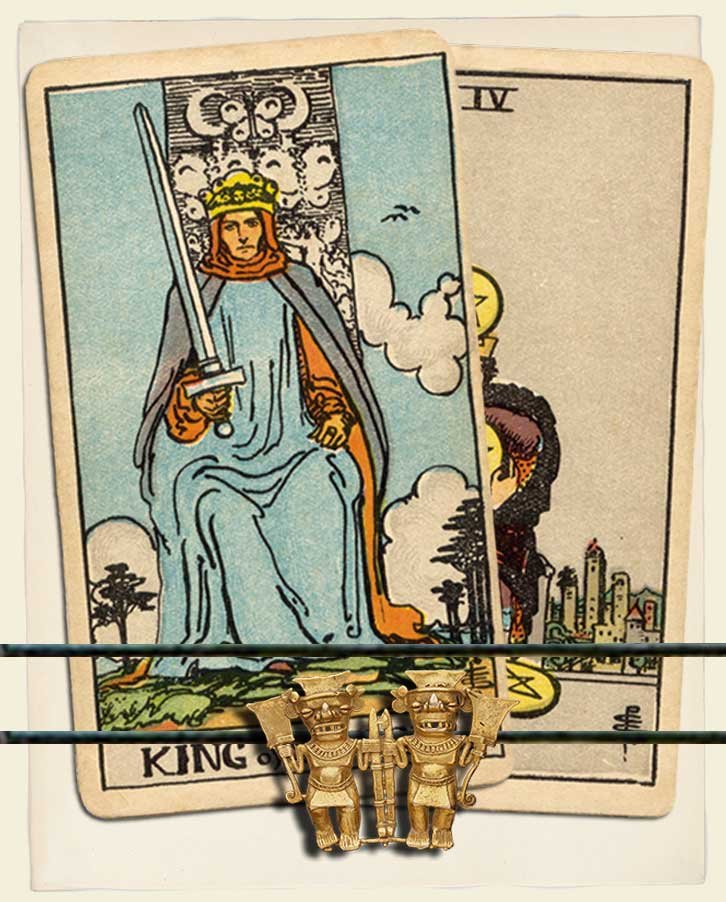 King of swords clarified by Four of pentacles gives a glimpse into your distant and barely discernible future, which will come to pass from the combined effect of (1) TRUTH (effect of King of swords) and (2) SCARCITY (effect of Four of pentacles). What you seek is what you find when the King of Swords meets the Four. This king has no time for games or half-truths. He wants everything on the table so he can make an informed decision about who to trust with his most valuable assets. If someone tries to pull one over on him, it could cost him dearly—maybe even his life. Don’t play around with this energy if you value honesty in your relationships.