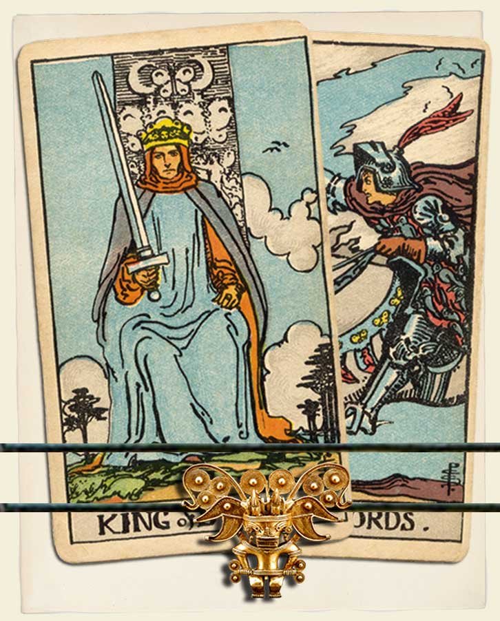 King of swords and Knight of swords combination gives a glimpse into a major event in your future. It is influenced by the tarot forces of (A) MENTAL CLARITY and (B) FOCUSED. The King of Swords can be an intimidating figure, but when he meets the Knight of Swords, it is as if this knight has been sent to protect the king from his own rash decisions. This knight may not agree with everything that the king says or does, but he will listen intently to what you have to say before passing judgment on your words or actions. You need clarity right now, so use this time wisely even if you don’t always agree with what this king has to say.