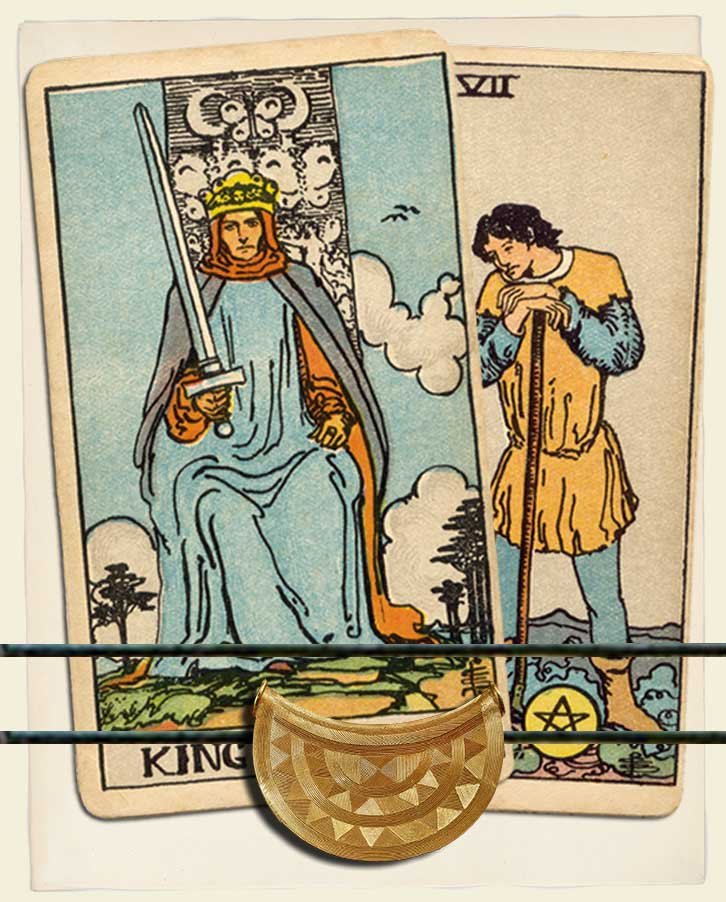 King of swords and Seven of pentacles combo provides an insight into a major event in your future, which will arise from the combined effect of: (I) INTEGRITY (effect of King of swords) and (II) HARVEST (effect of Seven of pentacles). How to interpret this tarot combination in practice? To put it differently, it means your love interest will show you their appreciation in a very special way. You have behaved in a loving and honorable way and shown them they are the only one in your heart. They will now begin to show the same loyalty to you – to your mutual delight.
