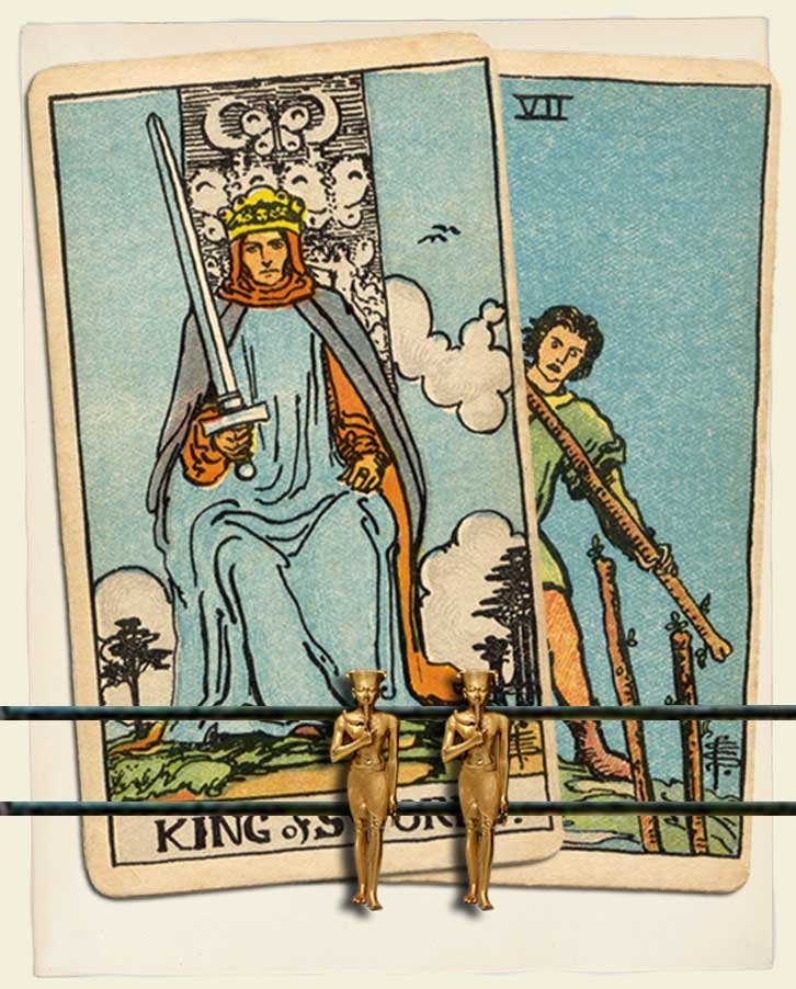 King of swords and Seven of wands combination gives an insight into your distant and barely discernible future. It is directed by the guiding influences of (A) REASON and (B) DETERMINATION. In a nutshell, you will soon face a great challenge. The weather has turned on you lately: you’ve become surrounded by a great blizzard of strife. Still, these cards are imploring you, don’t allow yourself to give in to panic. After all, you know this territory well. Don’t abandon the route that your feet know so well—even if your eyes deceive you.