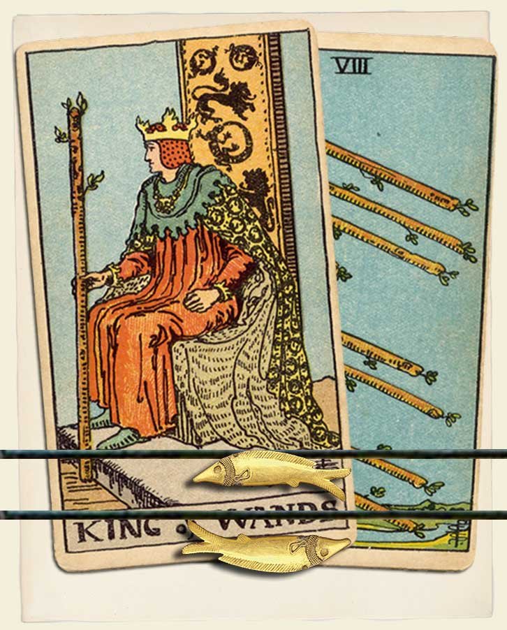 King of wands and Eight of wands combination provides an insight into your medium-term future, which is influenced by the arcane tarot forces of (A) VISION and (B) MOVEMENT. Life at the moment could be a flurry for us – we may want things done before we’ve finished thinking of them! This combination speaks of a vision we have – something that we consider to be the bigger picture, which is suggested by the King of Wands. This card also suggests a leader, one who is great at overcoming challenges, which is always a bonus! The supporting influence of Eight of Wands gives us movement, rapid action and quick decision making. Whatever ideas we have at the moment, we will be eager to get these going with this quick combo.