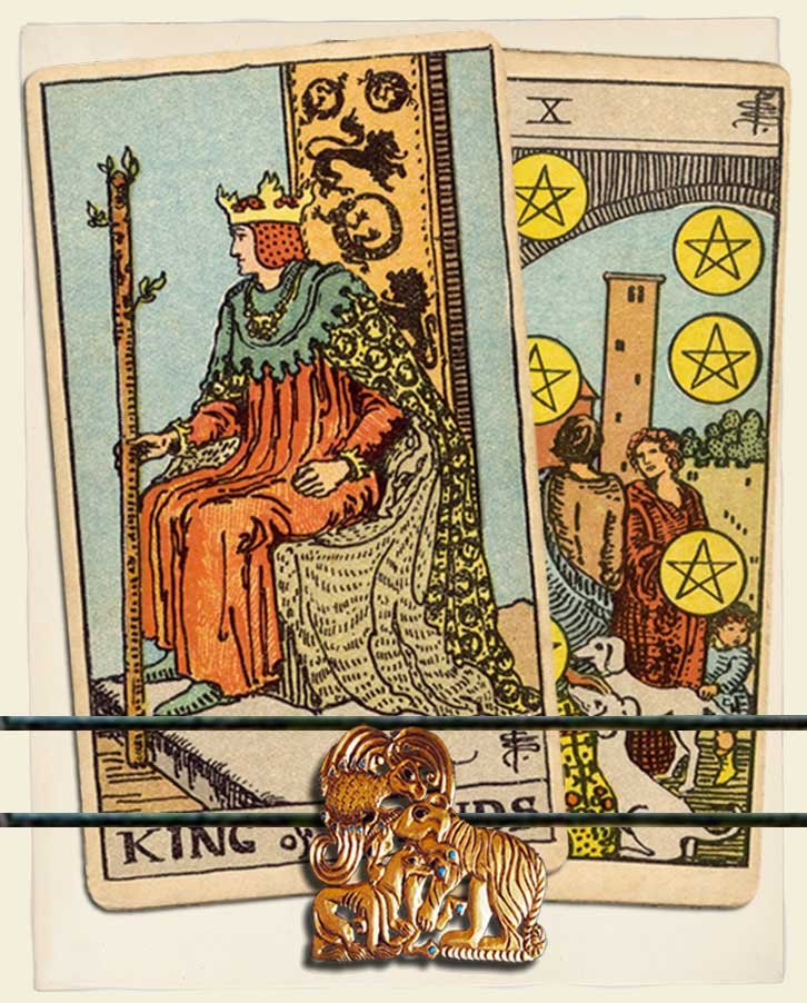 King of wands and Ten of pentacles together is a sign that two tarot influences: A) Natural-Born Leader (King of wands) and B) Wealth (Ten of pentacles) have influence on you at this moment. Do you remember that project you have put aside in your drawer? Well, now it’s the time to take it out and start making it real: entrepreneurial ideas, investments, daring moves… Don’t be scared to try, believe in yourself. People will see you shine, and walk along with you, enlightened by your vision. Stay on course towards the goal, and money is going to rain down on you!