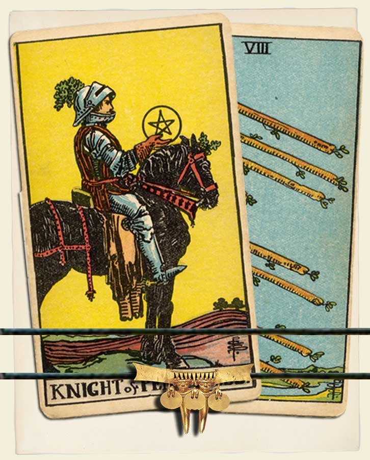 Knight of pentacles and Eight of wands together gives a hint about your actual state and close future, which will come to pass from the combined effect of (A) EFFICIENT (effect of Knight of pentacles) and (B) MOVEMENT (effect of Eight of wands). To put it differently, it means that you are in a position to create order out of chaos. What’s the advice of this pair? The Knight of pentacles is an energy that brings stability to its environment. It doesn’t matter whether you’re creating order out of chaos or just trying to get things back on track after they fell into disarray, this card indicates that you have the ability to do so. The Eight of wands represents rapid forward movement towards your goals. This may be overwhelming at times, but if you can keep up with the pace set by the Knight of pentacles , everything should fall into place for you.