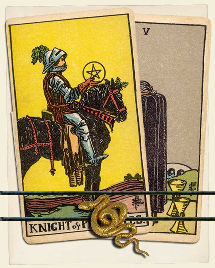 Knight of pentacles and Five of cups combination means that two tarot influences: (1) Reliable and (2) Discontent are steering you into another direction today. Most tarot readers would consider this to be a sign that you are looking for a lot of comfort in your life. You see what friends have, and you want the same. The cuddles, the trust, the companionship. You only see what they want you to see. If you really want a bond that strong, love yourself first. Everything else thereafter will follow.