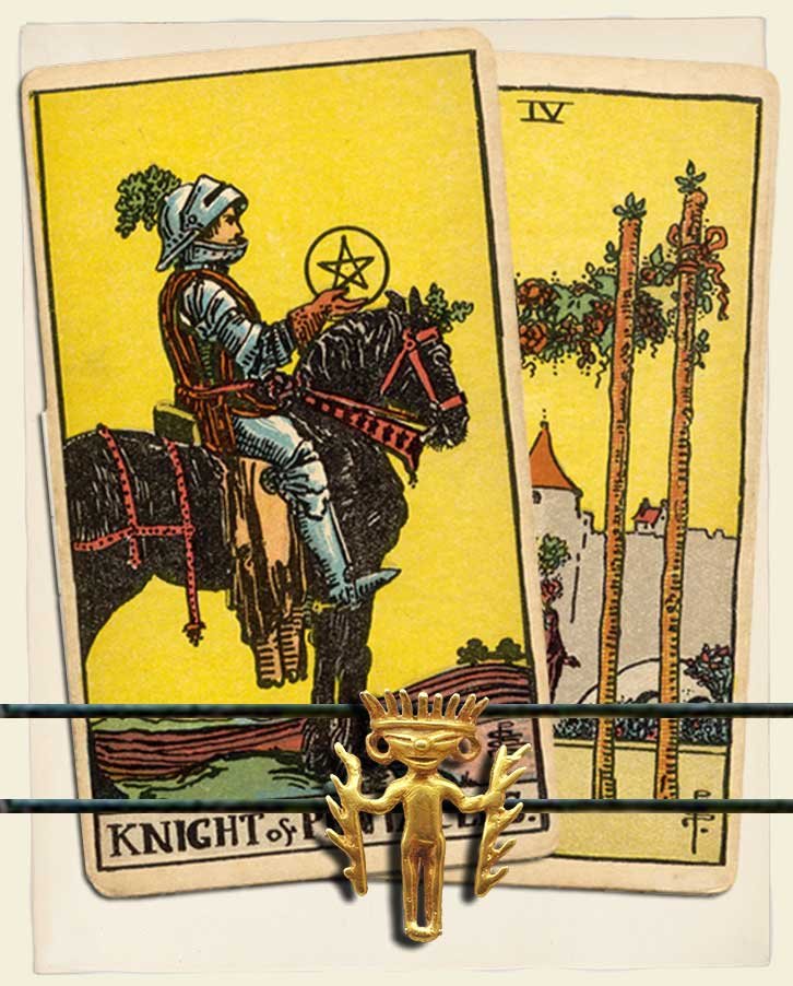 Knight of pentacles and Four of wands tarot combination means that tarot influences: 1) Reliable and 2) Homecoming are jointly affecting you today. A reading of this kind usually means that you are drawing closer to your destination. In fact, what you long for is just around the corner. But don’t get excited and run ahead: your consistency is what’s got you this far in the first place. Go slow and steady, these cards say, otherwise you’ll risk throwing it all away at the last minute.