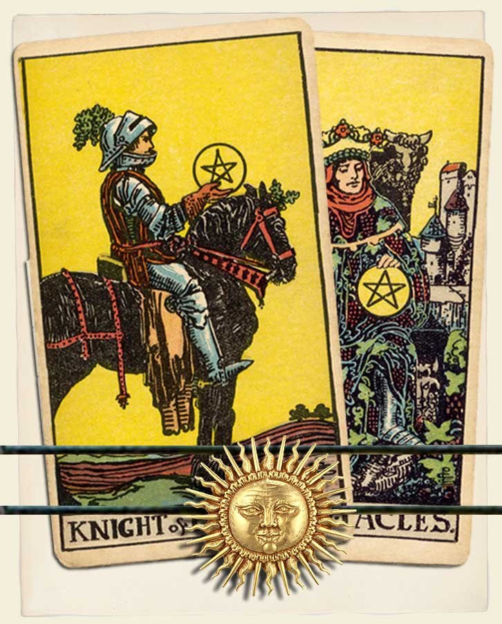 Knight of pentacles and King of pentacles together gives you intuition about your distant and barely discernible future, which is influenced by the tarot forces of (I) Efficient (from Knight of pentacles) and (II) Wealth that is ready for a thorough accounting, and there can be no better omen than the Knight of Pentacles with the king of that same suit. You have the command and self-possession to do what needs to be done when you receive this combination. If the time has come to reassess your values, you are in the perfect frame-of-mind, and if you need the help of a more serious nature to help you know what you need to do now, this is available too. This combination favorably aspects everything that requires a solid sense of value and an honest work ethic.