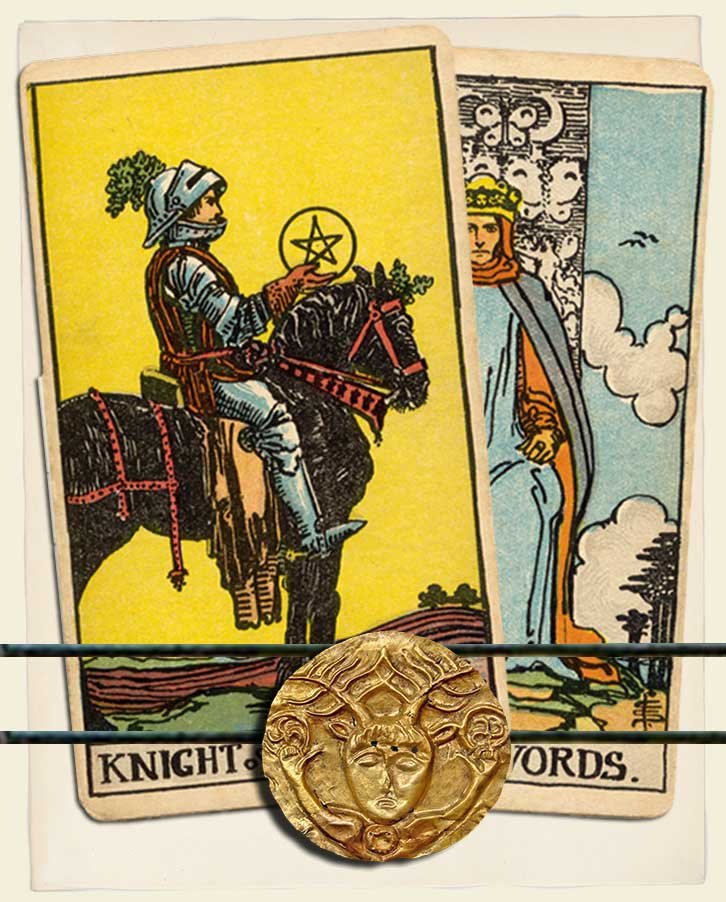 Knight of pentacles and King of swords combination gives you a hint about your medium-term future. It is influenced by the arcane tarot forces of (A) Hard-Working and (B) Intellectual Power. Most tarot readers would consider this a sign that you will be undertaking a project in which you bring your thoughts into reality. The Knight of Pentacles moves slowly, but he endures, which complements the vision of the King of Swords greatly. This is a time to trust in your mind, and keep moving forward to make your dreams a reality, you will make it to the end of this project, but it will require focus.